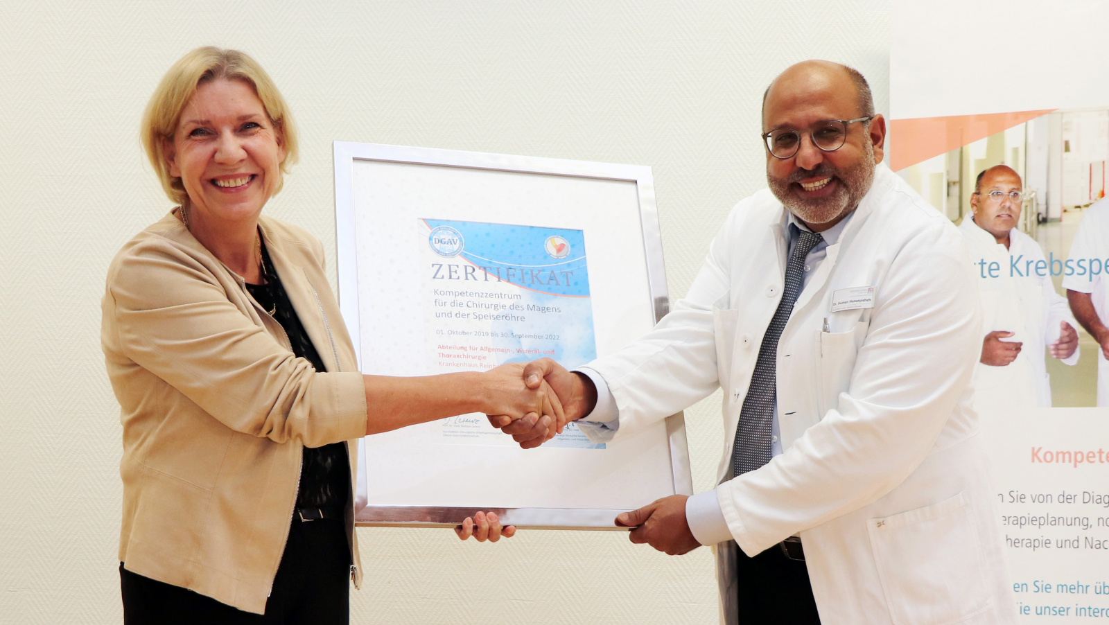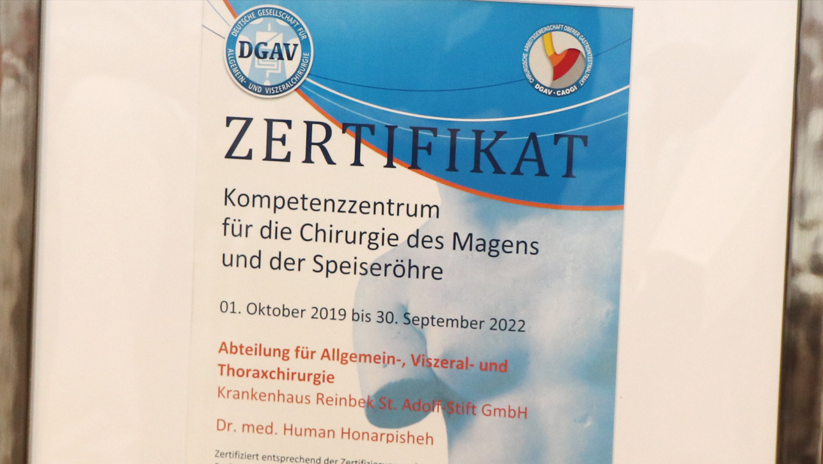 Das Zertifikat wurde heute (Dienstag, 12. November) durch die Deutsche Gesellschaft für Allgemein- und Viszeralchirurgie (DGAV) an Departmentleiter Dr. Human Honarpisheh überreicht. Der Experte für den oberen Verdauungstrakt blickt auf ein über 20-jährige Erfahrung – davon 13 Jahre als verantwortlicher Operateur zurück – und hat über 2.000 Eingriffe im oberen Gastrointestinaltrakt, davon mehr als 400 allein an der Speiseröhre, vorgenommen. Der 50-jährige gebürtige Iraner hat viele Ärzte ausgebildet und im Krankenhaus Reinbek erfolgreich Teams aufgebaut, die jeden Handgriff kennen. Mit ihnen hat Dr. Honarpisheh über ein Jahr auf die anspruchsvolle Zertifizierung hingearbeitet.