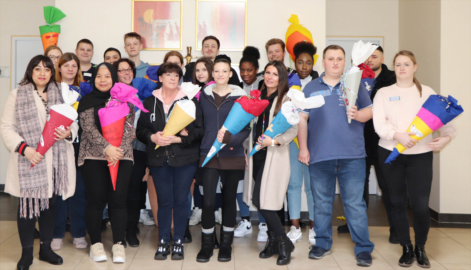 Anfang März starteten 22 Menschen in ihre dreijährige Ausbildung als Pflegefachkraft am St. Adolf-Stift. Zum Einstand erhielten sie von ihren älteren Mitschülern eine selbstgebastelte Schultüte. Vorne links im Bild: Schulleiterin Christa Knigge-Hartig, vorne rechts im Bild: Kursleitung Christiane Behrschmidt.