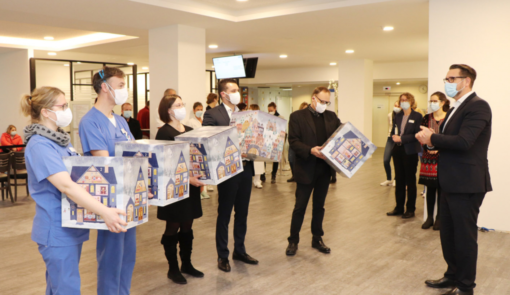 Da der zweieinhalbmonatige Umbau des Foyers im laufenden Betrieb vor allem von den Mitarbeitenden der Information, der ZNA und der Patientenanmeldung des St. Adolf-Stiftes einiges an Nervenstärke und Geduld abverlangt hatte, überreichte Geschäftsführer Björn Pestinger (rechts) den Teams große Adventskalender zur „Entschädigung“.
