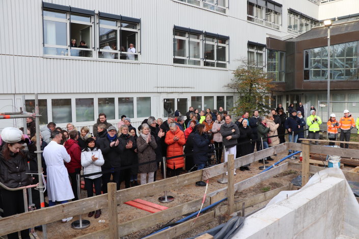 Um diesen Meilenstein mit den Mitarbeitenden und den Ordensschwestern zu feiern, wurden diese sowie die Architekten und Angestellte der Hochbaufirma am Mittwochvormittag in den Innenhof geladen. Dort sprachen neben dem Geschäftsführer und dem Ärztlichen Direktor des Krankenhauses auch der Architekt Markus Kasper vom Architektur-Büro Henke + Partner bevor Sie eine Zeitkapsel einmauerten.