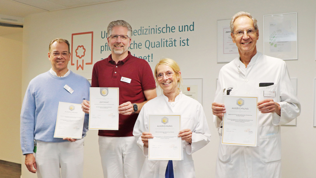 Gemeinsam mit dem Krankenhaus Reinbek und vielen niedergelassenen Kooperationspartnern hat sich das Nierenzentrum Reinbek und Geesthacht unter Prof. Markus Meier (2. v.l.) als Lipidologisches Kompetenzzentrum zertifizieren lassen. Damit sind sie eines von nur 12 in Deutschland, die Menschen mit genetischen Fettstoffwechselstörungen helfen können. Auf dem Bild freuen sich (von links nach rechts) über die Auszeichnung aus dem St. Adolf-Stift auch Radiologie-Chefarzt Gerrit Krupski-Berdien, Kardiologie-Chefärztin Dr. Britta Goldmann sowie der Ärztliche Direktor Prof. Dr. Stefan Jäckle.